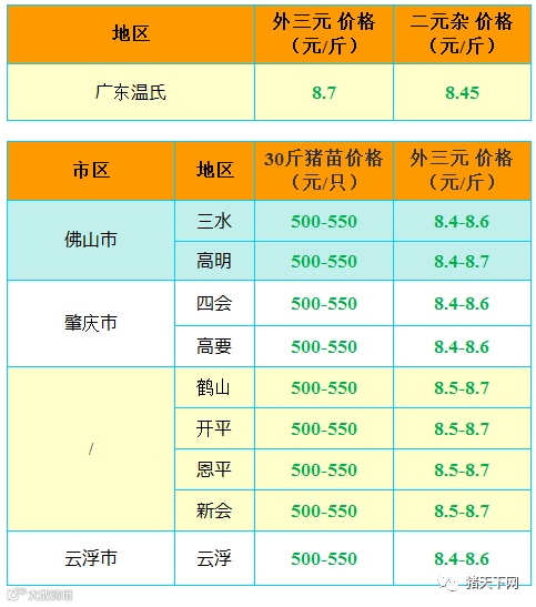 有红绿颜色部分是相对昨天有所变动的猪价;