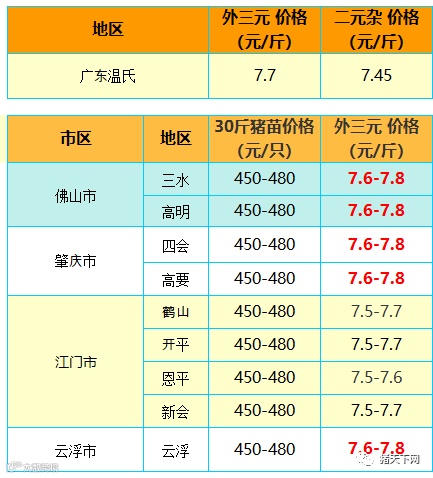 有红绿颜色部分是相对昨天有所变动的猪价;