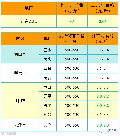 有红绿颜色部分是相对昨天有所变动的猪价;