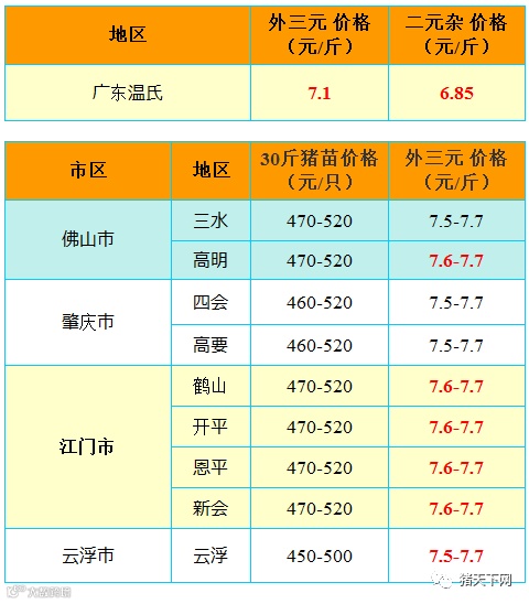有红绿颜色部分是相对昨天有所变动的猪价;