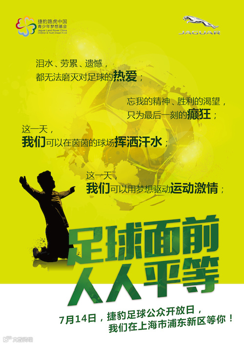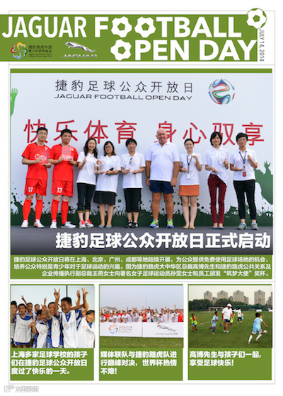 7月14日,在今年巴西世界杯总决赛结束的第二天,捷豹在上海正式宣布启动捷豹足球公众开放日活动,这是捷豹路虎中国青少年梦想基金成立后发起的首个公益活动,历时一个多月的巴西世界杯使车企营销战火纷呈,借用新锐汽车媒体李村的评论“对于汽车企业来说,前前后后几个月的世界杯足球营销也暂告一段落。不过,关于足球,关于体验,关于年轻人,关于未来的各种营销才刚刚开始,尤其是汽车企业的足球营销还未完!”