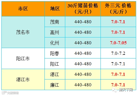有红绿颜色部分是相对昨天有所变动的猪价;