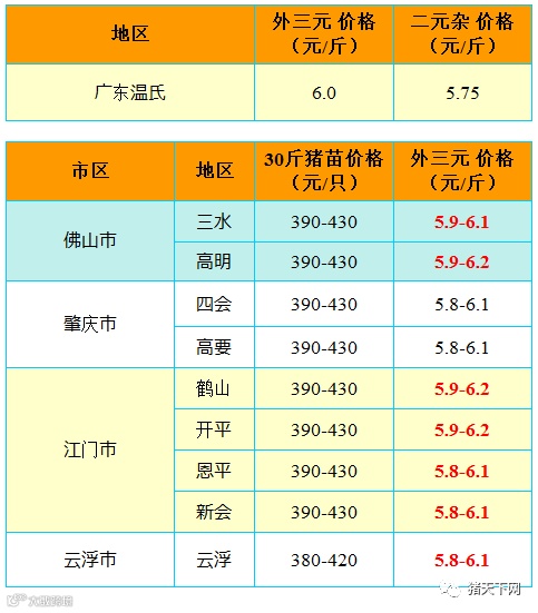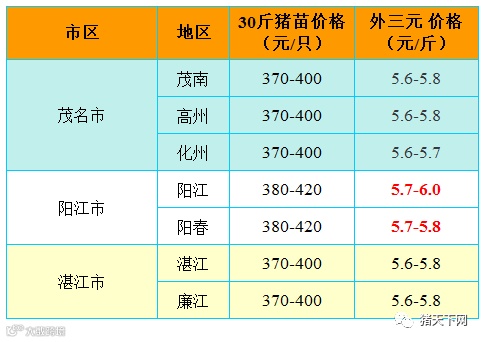有红绿颜色部分是相对昨天有所变动的猪价;