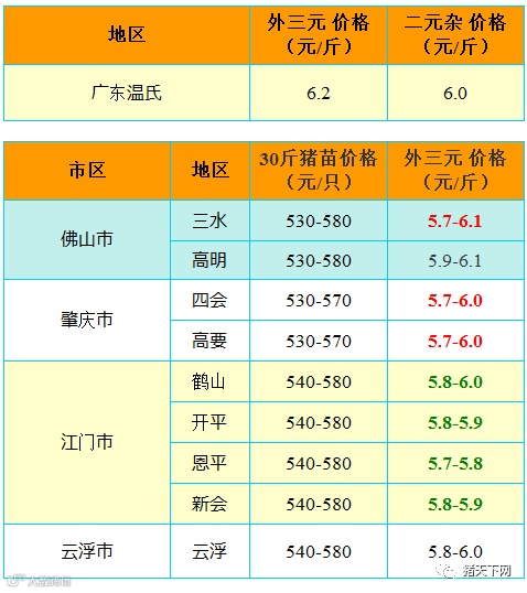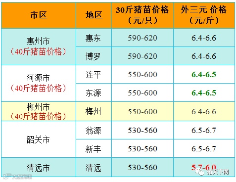 有红绿颜色部分是相对昨天有所变动的猪价;