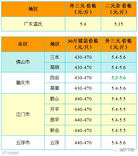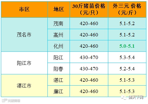 有红绿颜色部分是相对昨天有所变动的猪价;