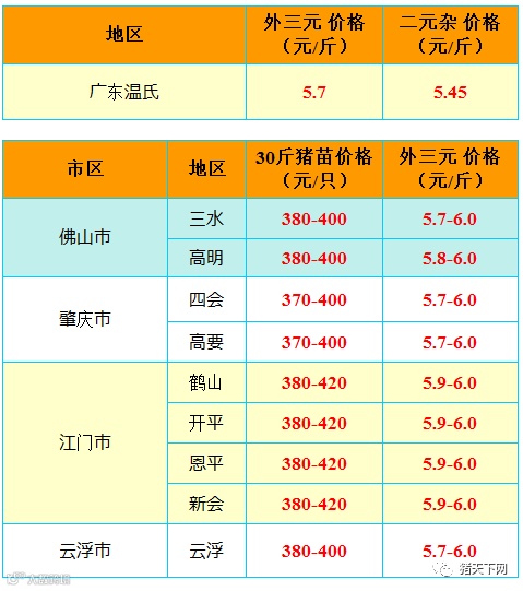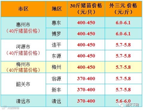 有红绿颜色部分是相对昨天有所变动的猪价;