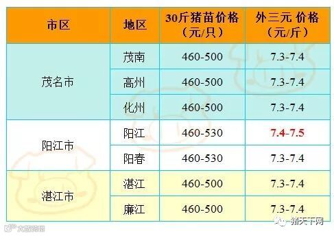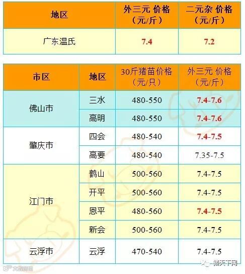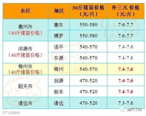 有红绿颜色部分是相对昨天有所变动的猪价;