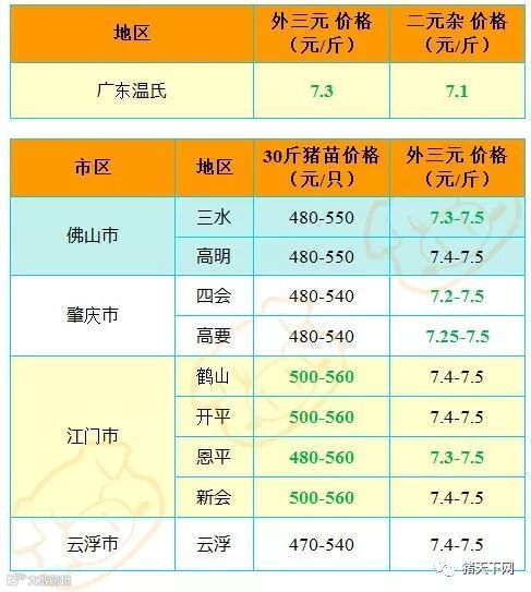 有红绿颜色部分是相对昨天有所变动的猪价;