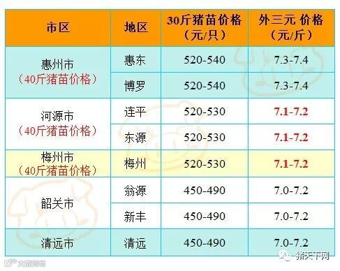 有红绿颜色部分是相对昨天有所变动的猪价;
