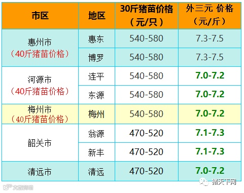 有红绿颜色部分是相对昨天有所变动的猪价;