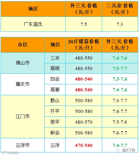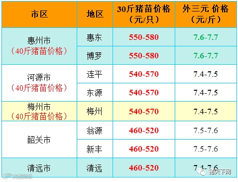 有红绿颜色部分是相对昨天有所变动的猪价;