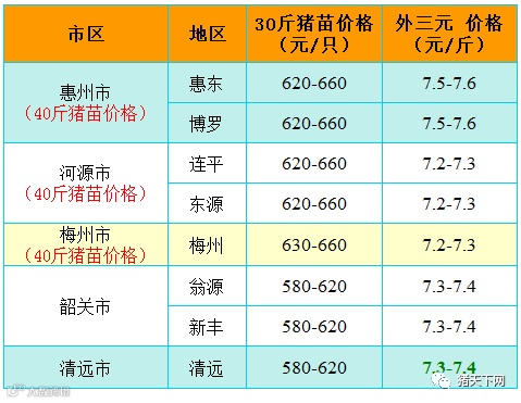 有红绿颜色部分是相对昨天有所变动的猪价;