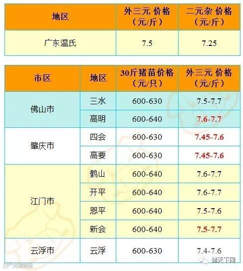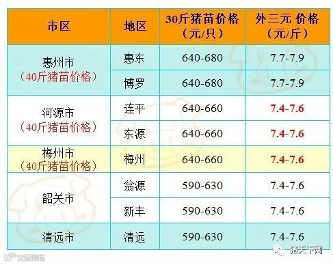 有红绿颜色部分是相对昨天有所变动的猪价;