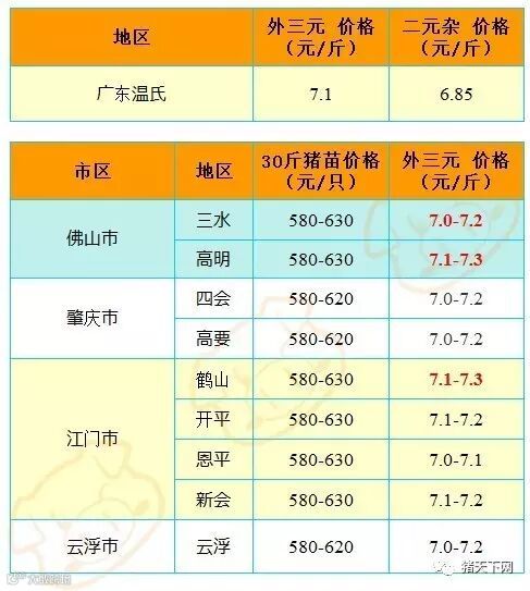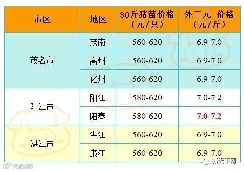 有红绿颜色部分是相对昨天有所变动的猪价;
