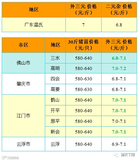 有红绿颜色部分是相对昨天有所变动的猪价;