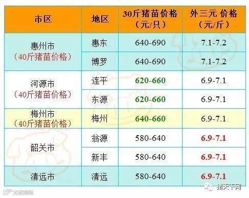 有红绿颜色部分是相对昨天有所变动的猪价;