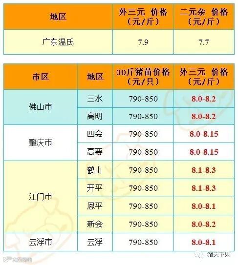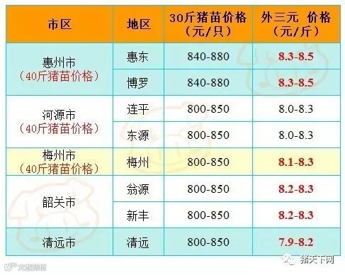 有红绿颜色部分是相对昨天有所变动的猪价;
