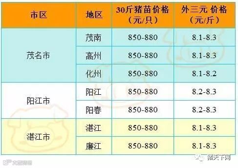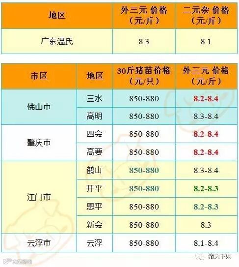 有红绿颜色部分是相对昨天有所变动的猪价;