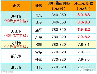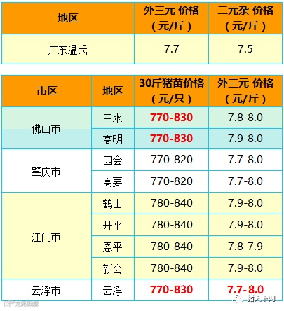 有红绿颜色部分是相对昨天有所变动的猪价;