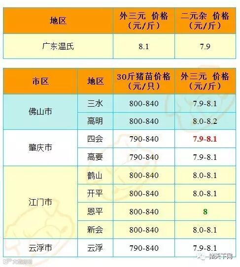 有红绿颜色部分是相对昨天有所变动的猪价;