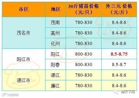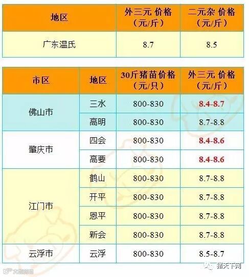 有红绿颜色部分是相对昨天有所变动的猪价;