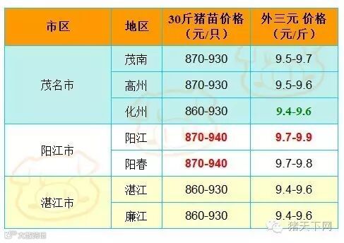 有红绿颜色部分是相对昨天有所变动的猪价;