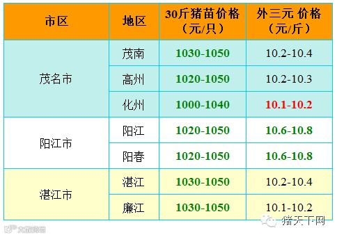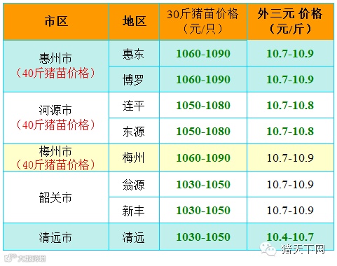 有红绿颜色部分是相对昨天有所变动的猪价;