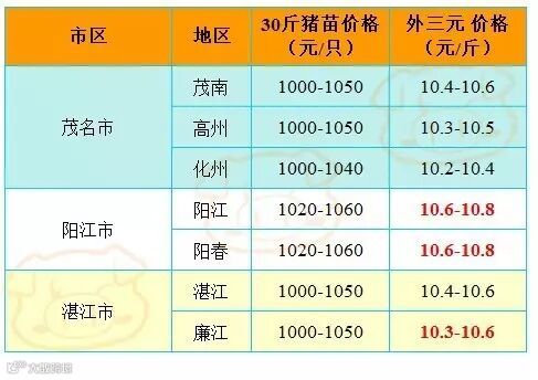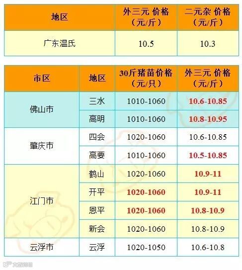有红绿颜色部分是相对昨天有所变动的猪价;