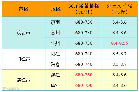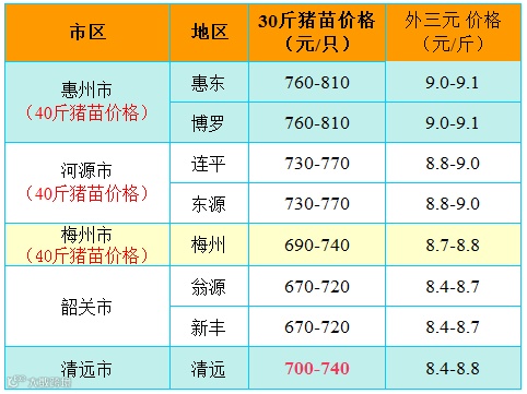 有红绿颜色部分是相对昨天有所变动的猪价;