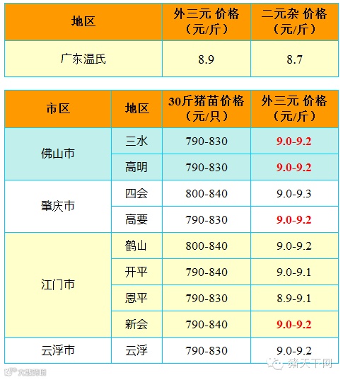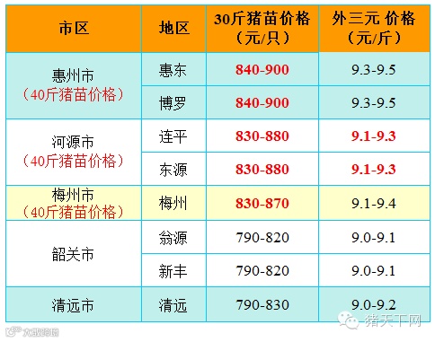 有红绿颜色部分是相对昨天有所变动的猪价;