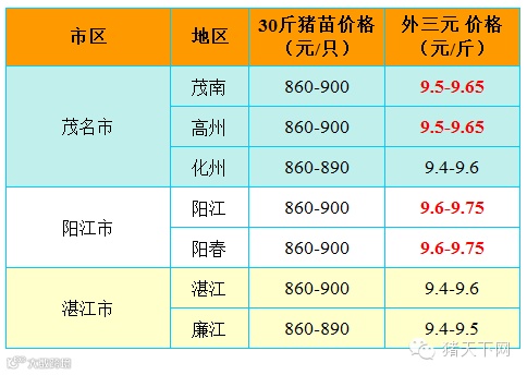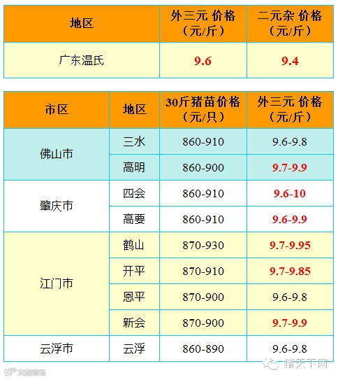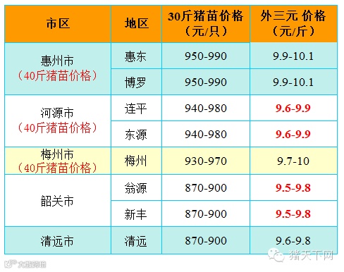 有红绿颜色部分是相对昨天有所变动的猪价;