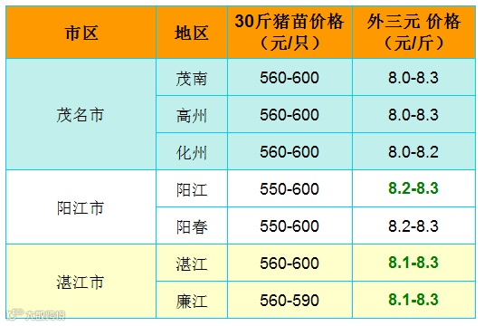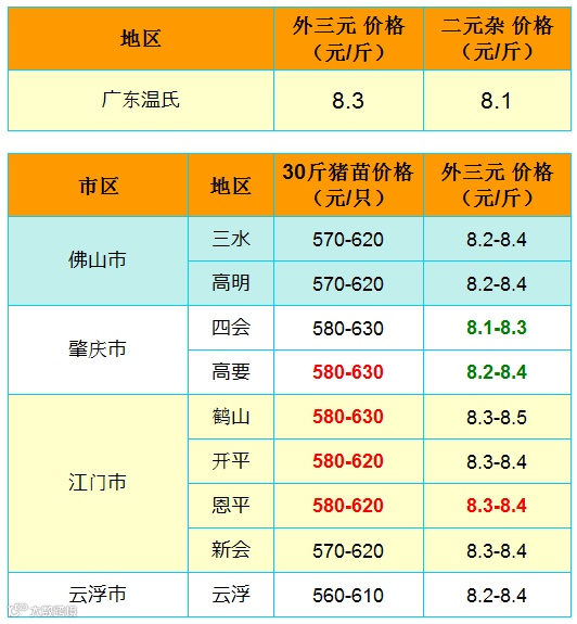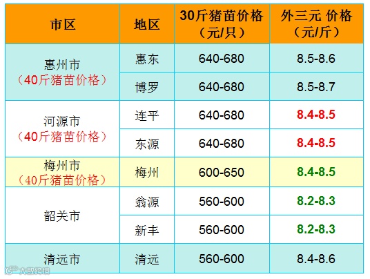 有红绿颜色部分是相对昨天有所变动的猪价;