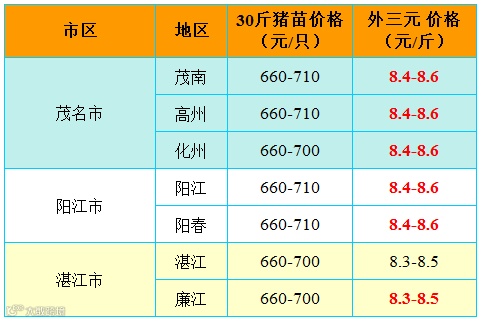 有红绿颜色部分是相对昨天有所变动的猪价;