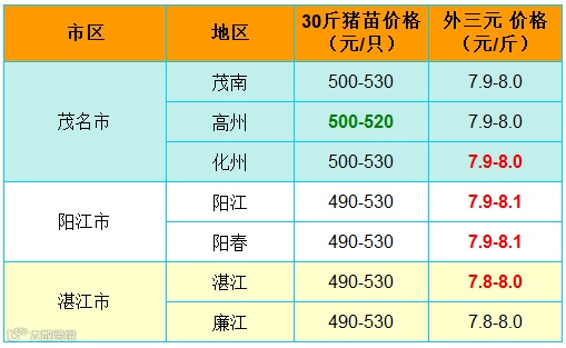 有红绿颜色部分是相对昨天有所变动的猪价;