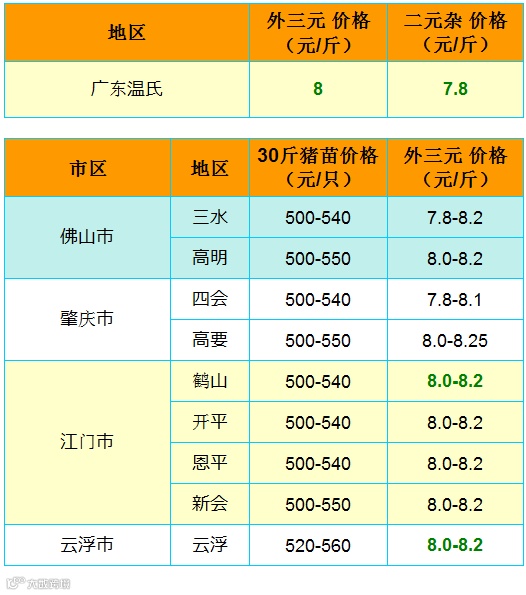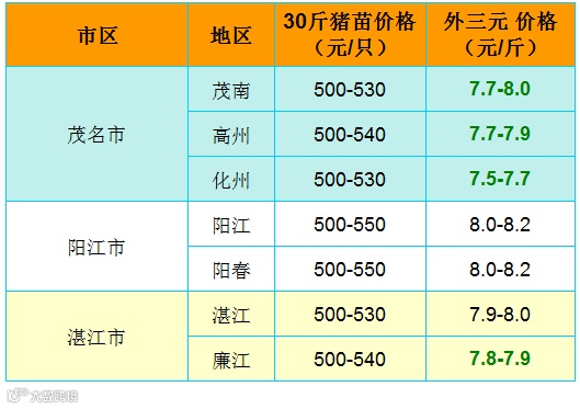 有红绿颜色部分是相对昨天有所变动的猪价;