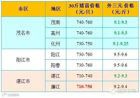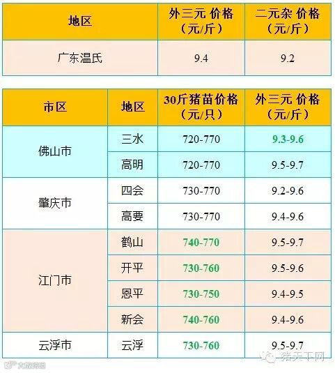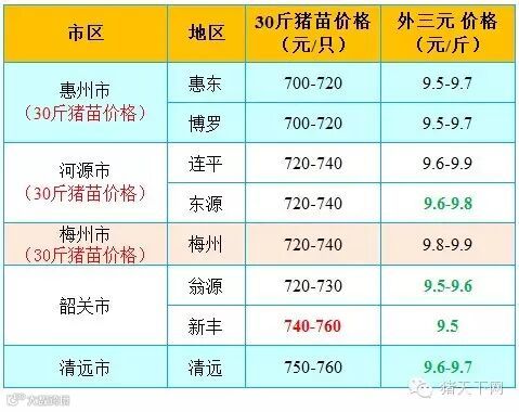 有红绿颜色部分是相对昨天有所变动的猪价;