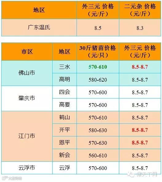 有红绿颜色部分是相对昨天有所变动的猪价;