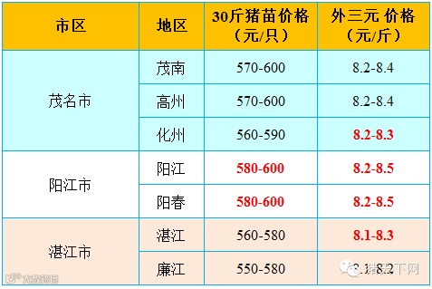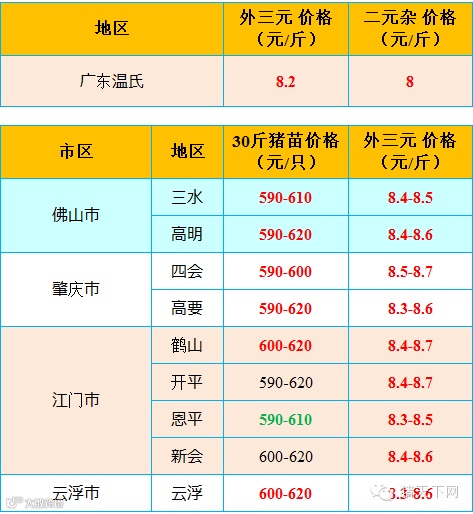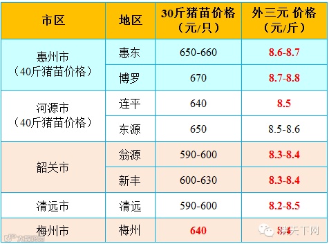 有红绿颜色部分是相对昨天有所变动的猪价;