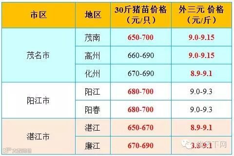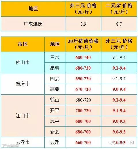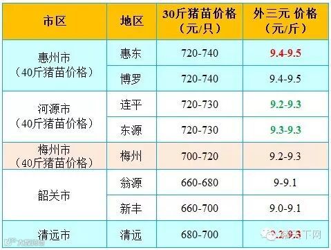 有红绿颜色部分是相对昨天有所变动的猪价;