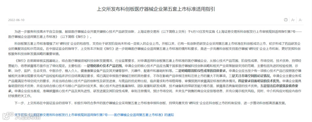 2022年6月10日,上海证券交易所发布《上海证券交易所科创板发行上市审核规则适用指引第7号——医疗器械企业适用第五套上市标准》,支持尚未形成一定收入规模的“硬科技”医疗器械企业在科创板发行上市。