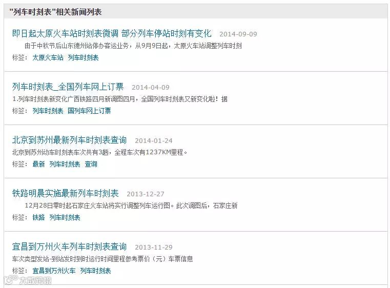 3, 制作低质静态搜索结果页或TAG标签页:很多网站都采用了将站内搜索结果页转为静态页面的方式,整合站点资源,以期形成相关性得分高的页面。但实际来看,很多站点通过站内搜索或者tag生成的页面相关性并不好,或者说产生了许多对百度搜索结果造成负面影响的页面。如果整个目录都存在这样的现象,那么被惩罚的可能性就非常大了。如下方截图,用户搜“列车时刻表”,这样的页面对他来说毫无价值。该页面所在的目录或站点做了很多类似内容的页面,且已经对作用造成恶劣影响时,极容易受到搜索引擎的惩罚。