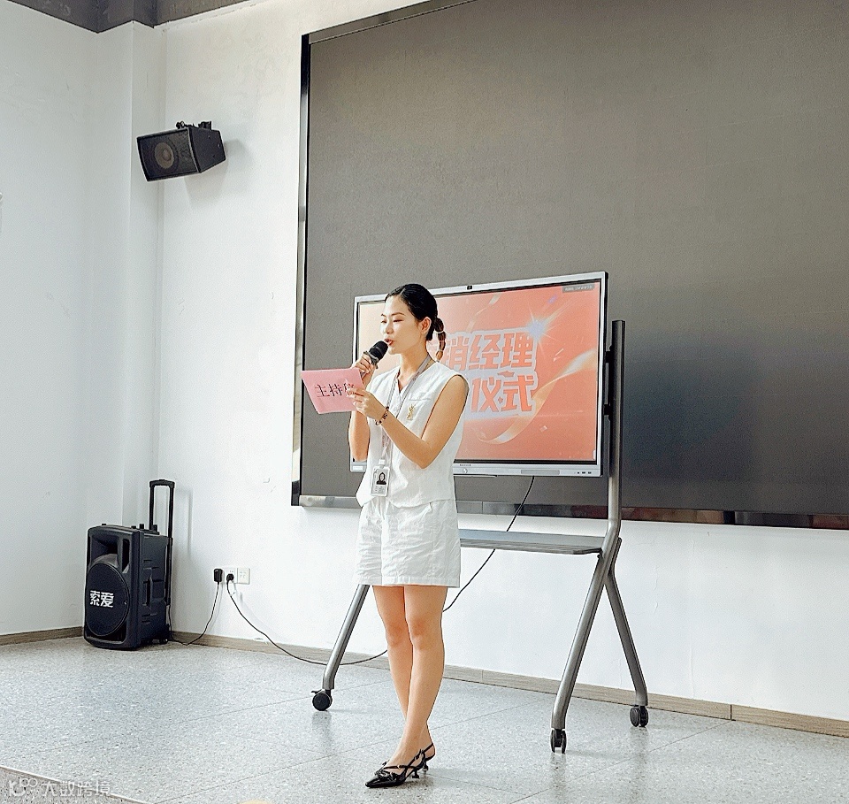 仪式在激昂的音乐声中拉开帷幕。首先,营销中心总经理涤生发表了热情洋溢的讲话,对晋升经理的工作表现给予了高度评价,并鼓励他们在新的岗位上继续发挥自己的专业优势,为公司的发展贡献更多的力量。