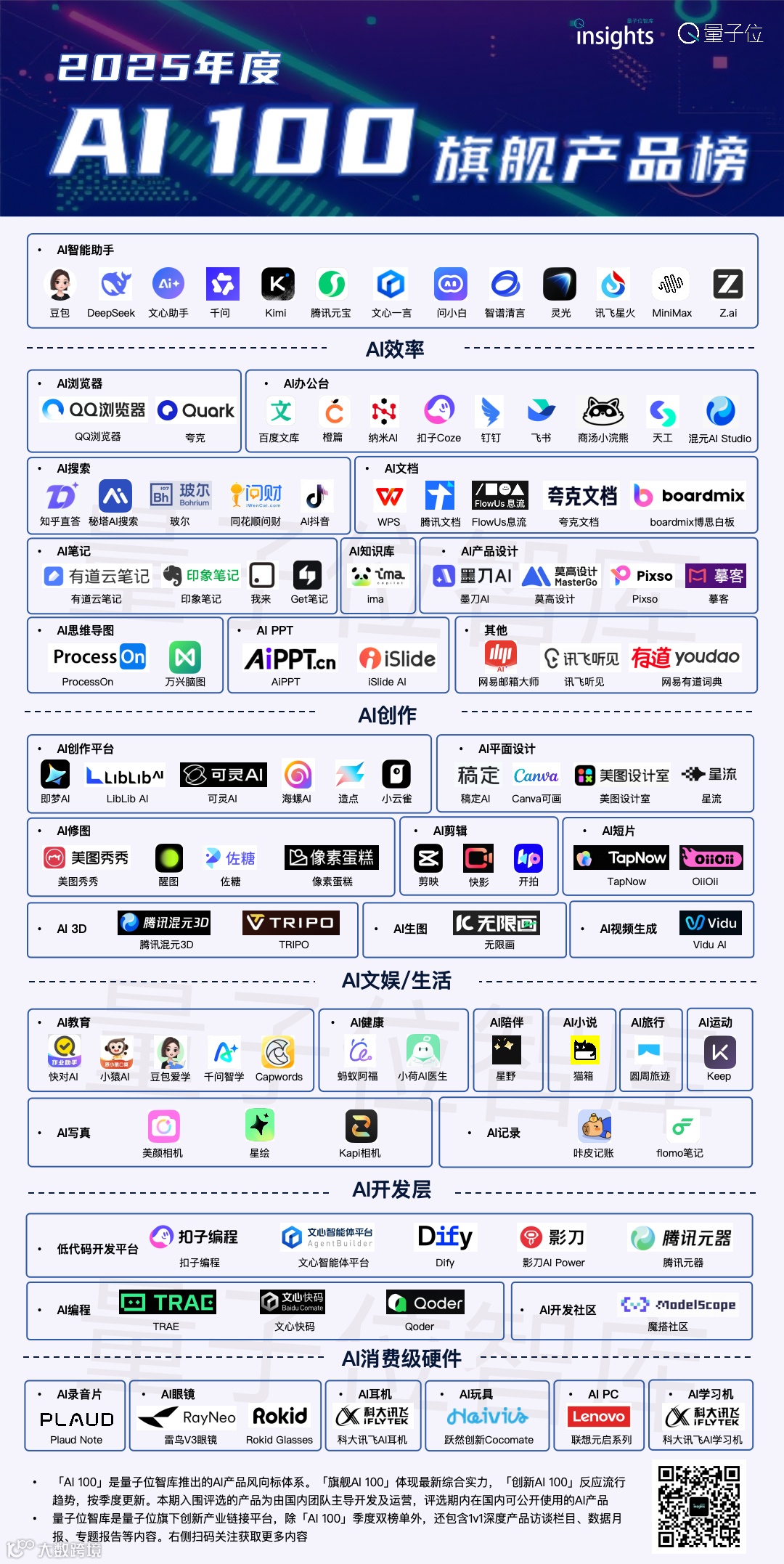 「AI 100」是量子位智库推出的AI产品风向标系列内容,旨在全维度地提供AI技术驱动下,产品长期创新和变革的第三方参考。目前主要由「旗舰AI 100」和「创新AI 100」构成,两者分别代表当前格局中的领军阵营和未来市场的种子选手,按季度发布。