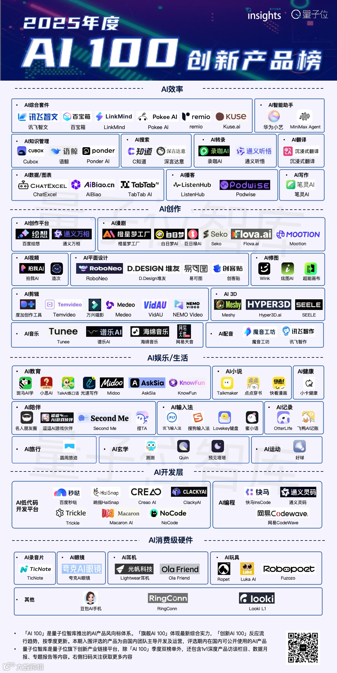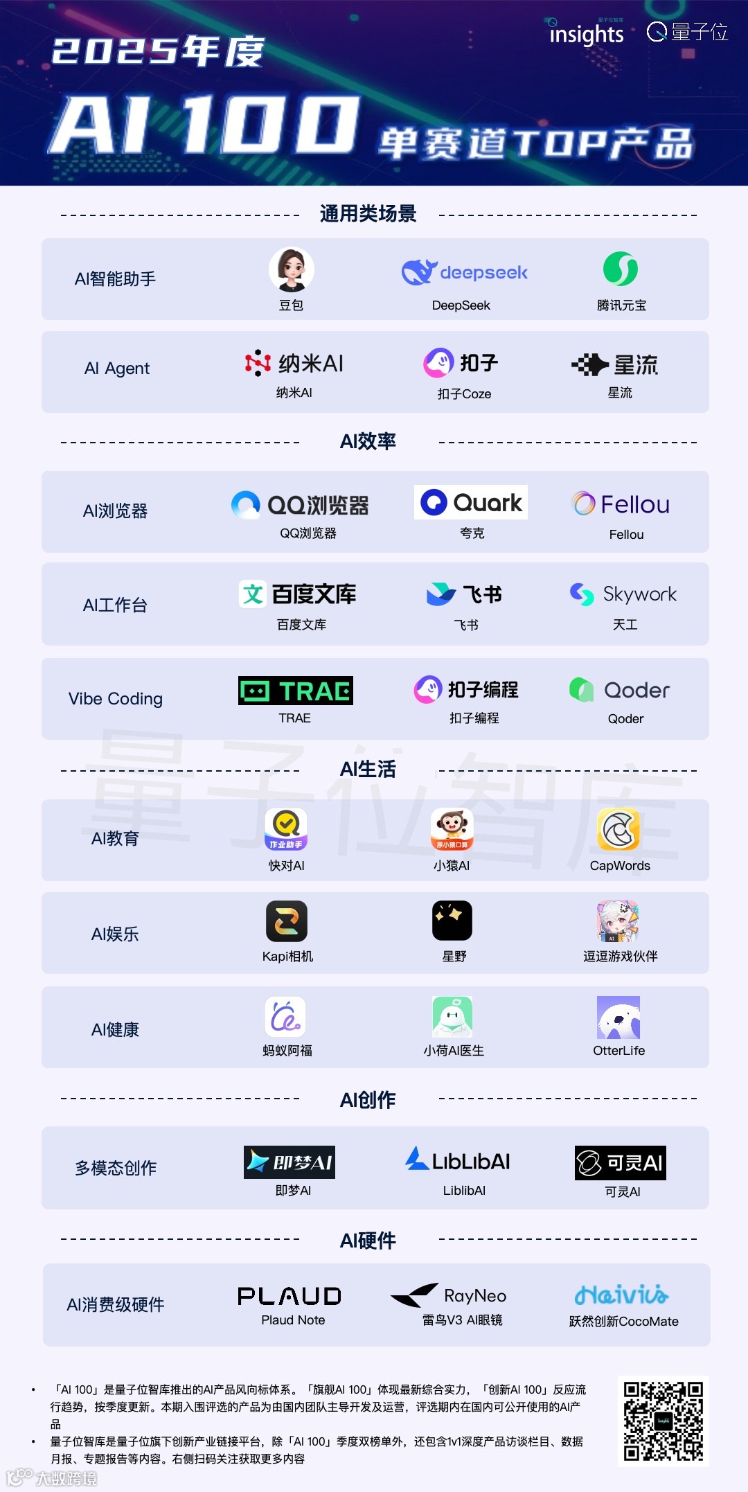 量子位智库通过三大板块——最强综合实力的「旗舰AI 100」、最具未来潜力的「创新AI 100」和十大热门赛道代表产品,全面梳理2025年度国内C端AI产品的发展脉络与创新成果。