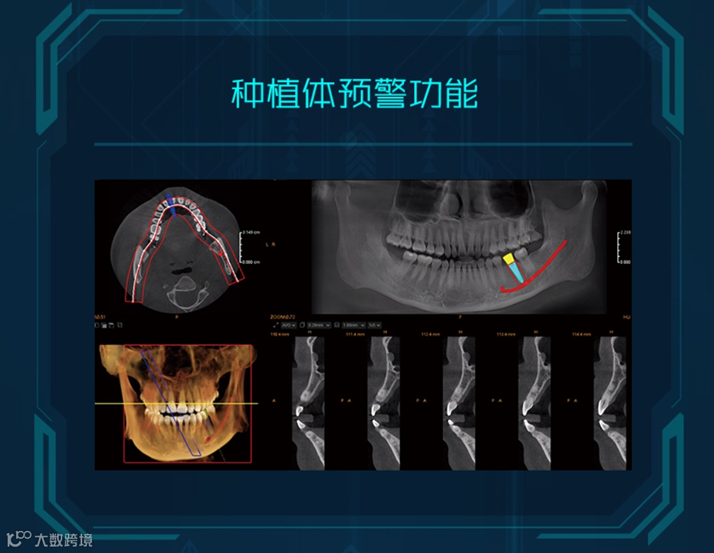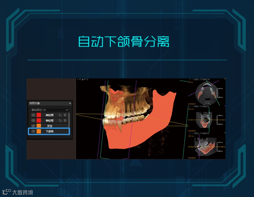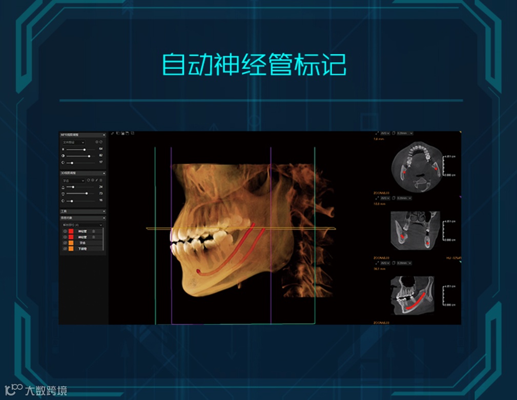悟空CBCT作为其数字化影像终端,除了世界级的工业设计,还能更好链接DX云影、云芯模块;尤其在AI加持下,可“重构想象空间”,包括:种植体预警、自动神经管描绘、自动牙齿分割、自动下颌骨分离等海量应用。