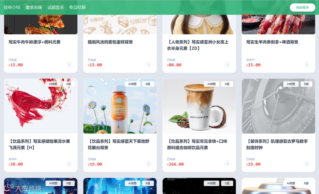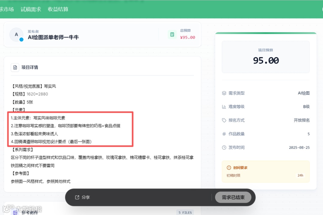 8月份,我接到了第二单。一个新兴饮料品牌需要五张产品场景图,预算95元。