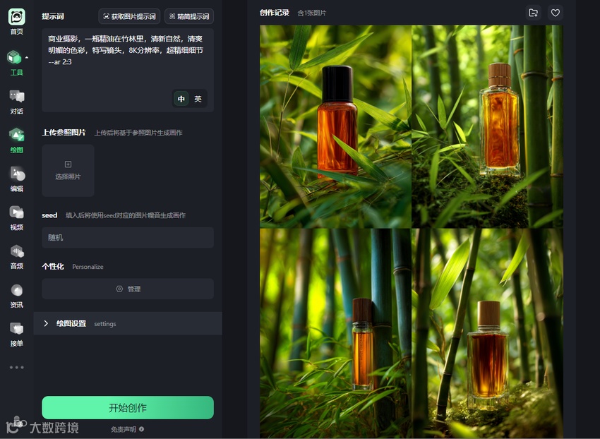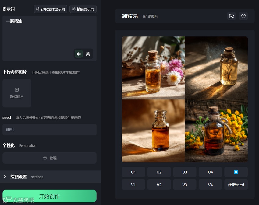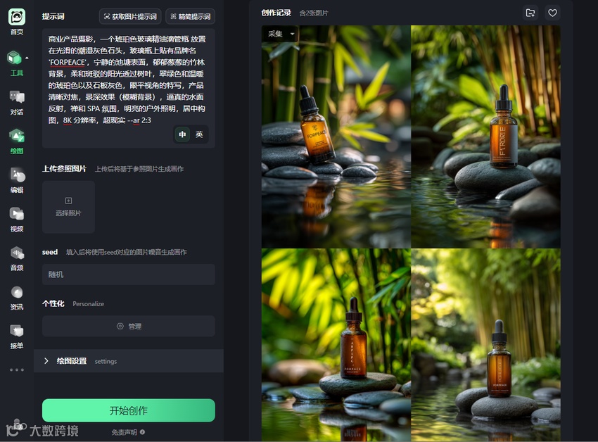 “会呼吸的精油” → 翻译为 “逼真的水面反射,禅意与SPA氛围,明亮的户外照明”