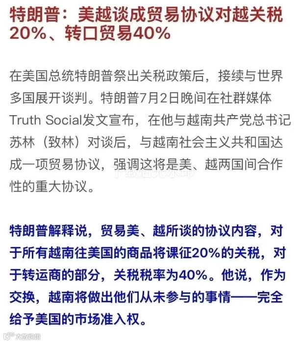 程载国际物流美国关税谈判,传出新进展!当地时间7月2日,美国总统特朗普表示,美国已经与越南达成贸易协议。