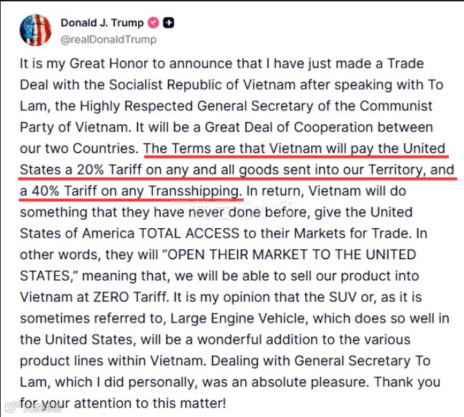 特朗普当天在社交媒体“真实社交”上发文称,与越南达成一项贸易协议,“稍后公布细节!”特朗普随后又发帖文称,越南所有对美出口商品将面临至少20%关税,并对美国“完全开放市场”。
