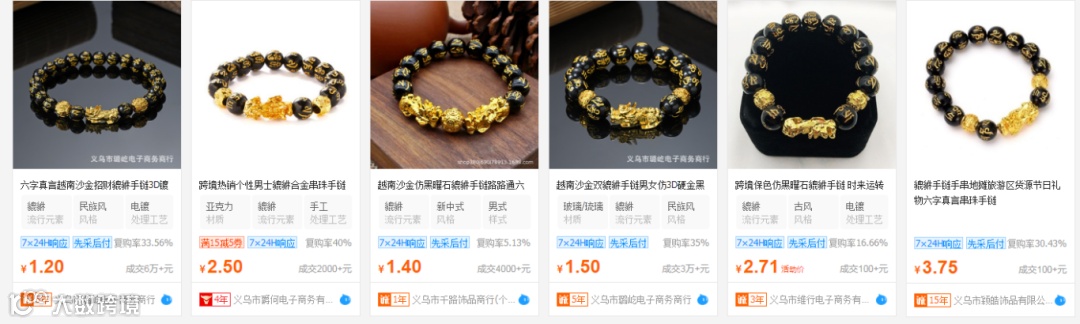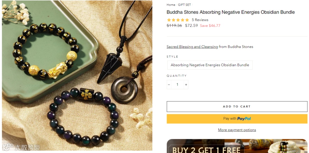 一款普通男貔貅手串,国内1688批发价约2元人民币;在Buddha Stones独立站售价为72美元(约合520元人民币)——溢价超100倍。此类高溢价产品在其站内占比极高。